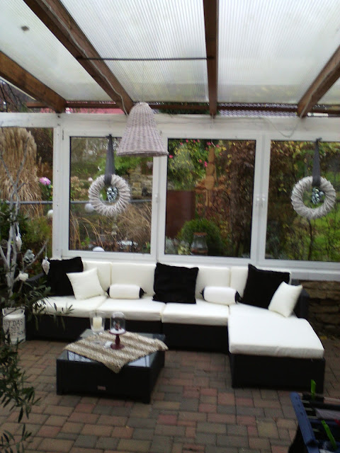 Wir haben uns eine Lounge für unsere Terasse geholt, mein Mann hat einen Kamin aus einem alten Wasserspeicher gebaut und nun können wir im Winter am Feuer sitzen und Glühwein schlürfen.