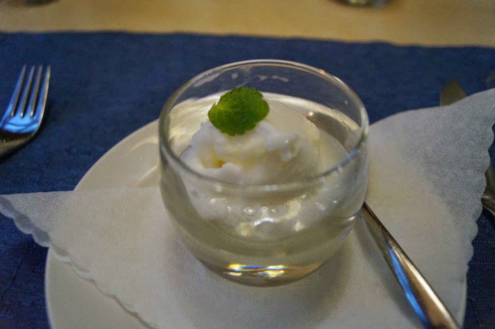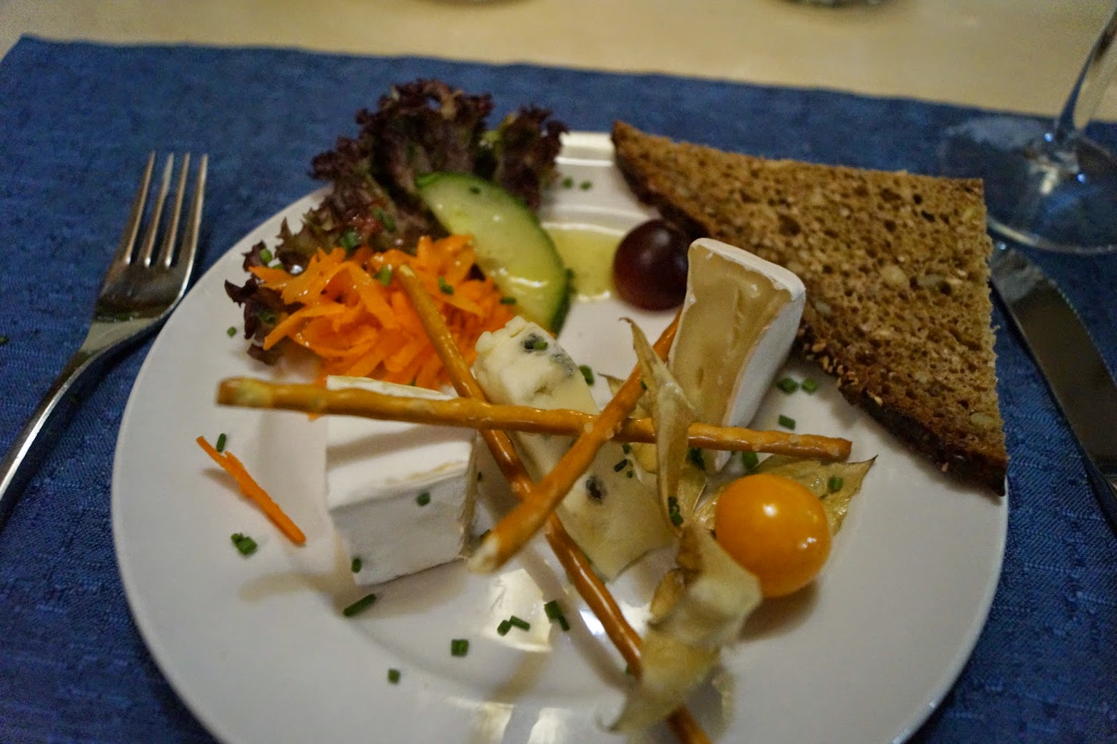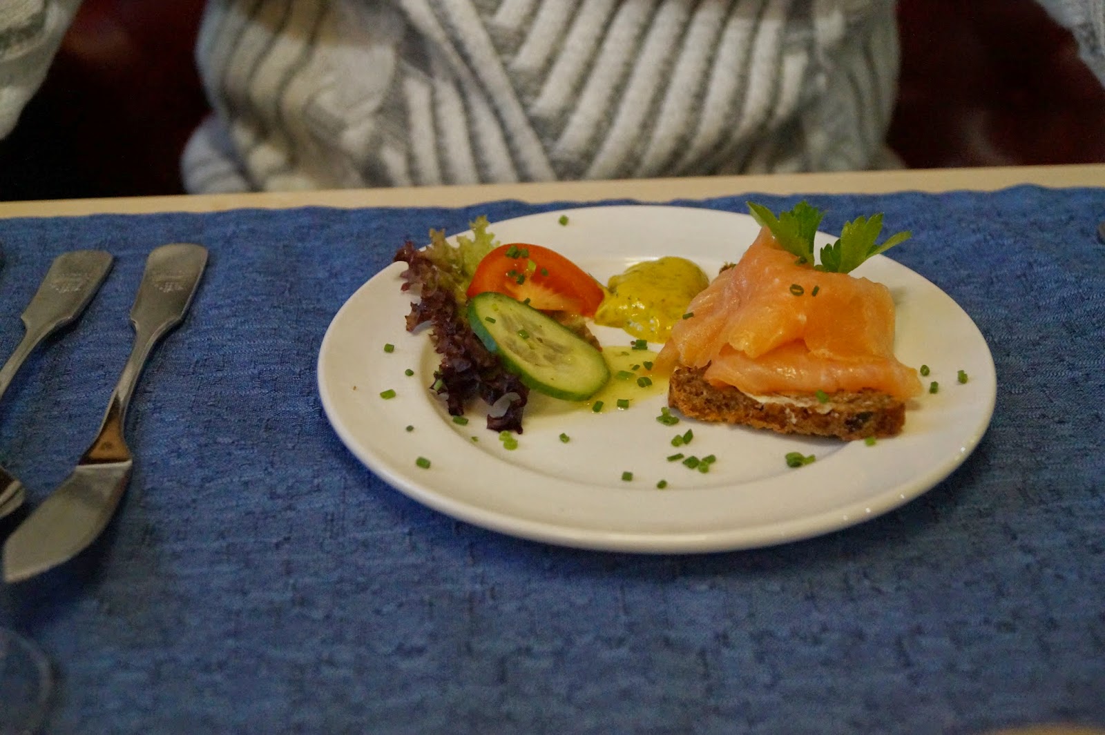 | wir hatten ein 5 Gänge Menü, mein Mann hatte Lachs auf schwarz Brot und ich geräucherte Entenbrust |