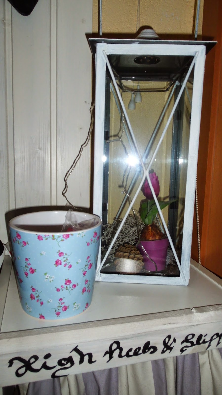 Es ist unglaublich aber meine Männer haben mehr Schuhe als ich. Das kleine Regal mit der Aufschrift High heels & Slippers habe ich aus einem einfachem Ikea Regal gebastelt und da stehen meine Schuhe drin. Auf dem Schuhschrank möchte ich anstatt des Flechtkorbes eine weiße Obstkiste vom Holländischen Blumenmarkt haben. Die Laterne ist auch von dort, reduziert von 70€ auf 25€ !!!
