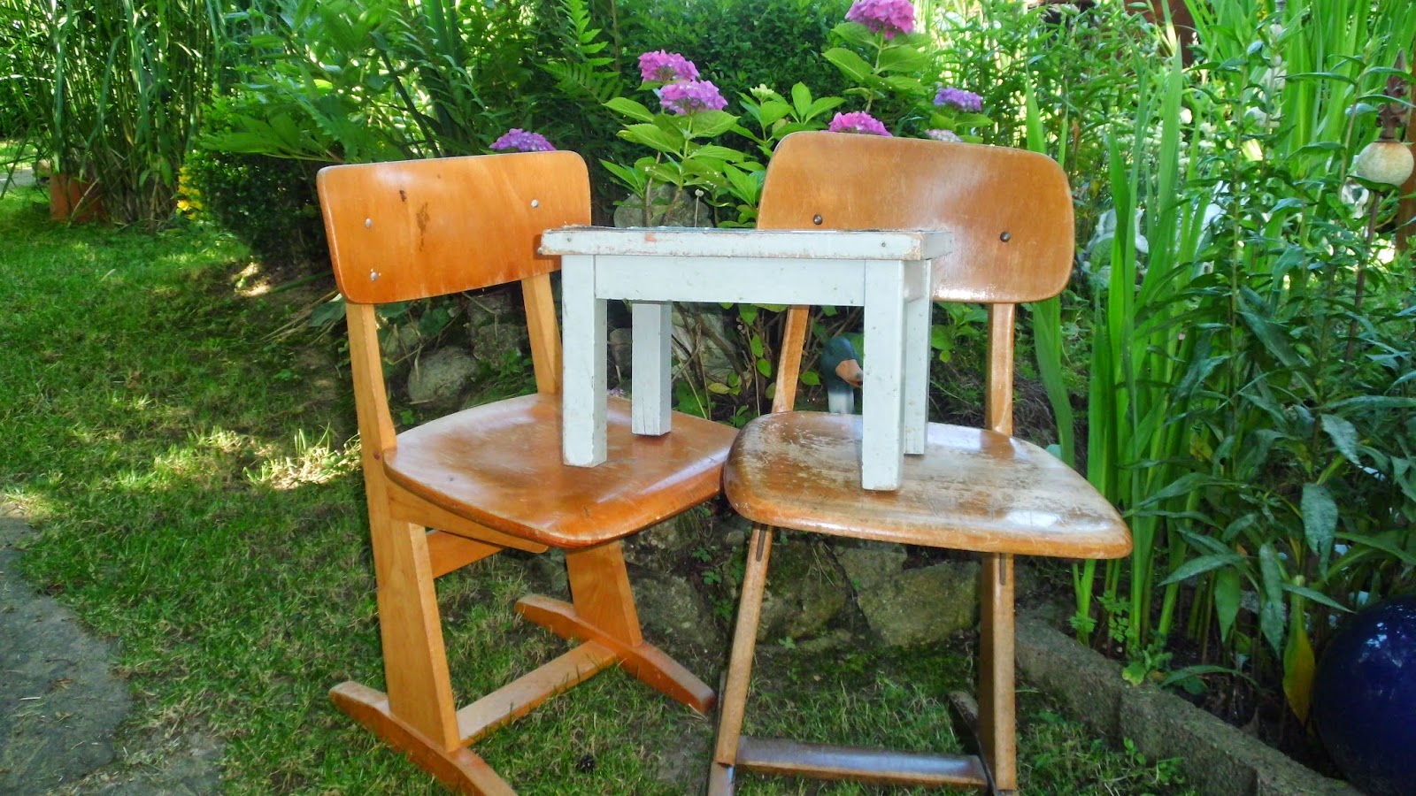 entrümpelt, das haben meine Jungs gesehen und mich dort hingeschickt. Leider war alles so in einander gestellt, das es schwierig war Sachen wieder heraus zu holen. Aber ich habe 4 Stühle, einen Hocker (echt Shabby) und eine grüne Tischplatte ergattert. Da ich vor einiger Zeit schon einen Schulschreibtisch von einem Feuerwehrkollegen meines Sohnes bekommen habe, konnte ich mir die Wuchterei mit den Tischen sparen.Den Schreibtisch hat mein Neffe für sein Zimmer bekommen und mein Schwager hat ihn richtig schön gestaltet. Jetzt fehlten halt nur die passenden Stühle! Max hat sich einen bunten und einen braunen Stuhl ausgesucht und schon mitgenommen, habe davon also kein Bild mehr machen können.